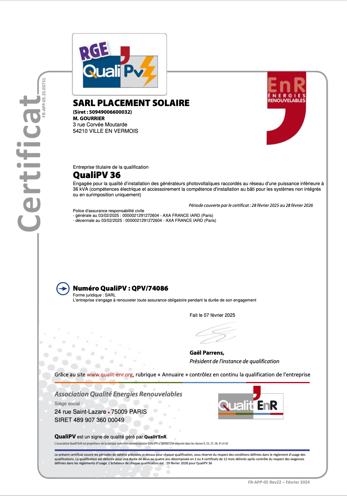 Comme tous les professionnels du bâtiment, Placement Solaire est titulaire d'une assurance professionnelle responsabilité civile et d'une assurance décennale auprès de AXA.